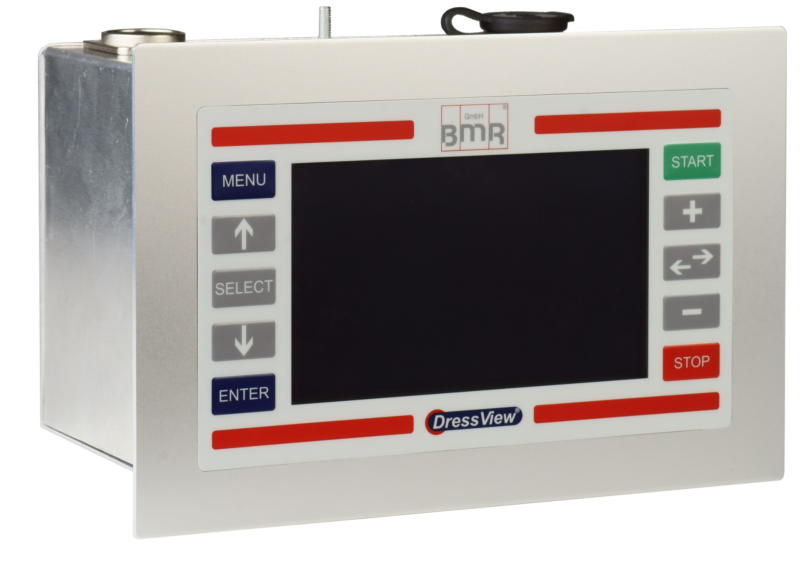 Dieses Abrichtystem ist das weltweit Erste, welches sensorlos arbeitet und den Vorteil hat , dass es ohne irgendwelche Sensoren in der Spindel auskommt und daher auch preisgünstigere Spindeln für das Abrichten verwendet werden können.DressView®wird zusammen mit einem Frequenzumrichter in einem Tischgehäuse als integrierte Lösung angeboten sowie als Stand-Alone Lösung als getrenntes System, was sich besonders für den Einsatz im Schaltschrank anbietet. (Hier ist dann der Frequenzumrichter und eine Dockingstation für das DressView® verbaut.)Das aus dem Betrieb der Spindel abgeleitete Signal wird graphisch auf einem LCD-Display dargestellt. Zur Signalausgabe an die SPS kann jeweils ein Grenzwert für die Signalerfassung und zusätzlich ein höherer für eine potentielle Crash-Erkennung eingestellt werden.Bei der Überschreitung des Grenzwertes wird das Mess-Signal rot eingefärbt und ein entsprechender Ausgang geschaltet.Das DressView®-System ist über seitlich angeordnete Folientasten mit deutlichem Schaltpunkt sehr einfach bedien- und einstellbar. Für den Abrichtprozess können vielfältige Einstellungen vorgenommen werden, wie z.B. das Nachleuchten der letzten Messvorgänge als Schattenbilder, die Zeitbasis der Darstellung oder die Skalierung der Anzeige. Zur Kommunikation mit der SPS stehen 3 Digitaleingänge, 3 Digitalausgänge und ein Analogausgang zur Verfügung. Hierüber kann das System gestartet und der aktuelle Status ausgegeben werden. Der Analogausgang gibt direkt das Mess-Signal des Abrichtvorgangs aus.Tests zeigen, dass es in der Sensibilität und Feinfühligkeit mit den etablierten Sensor-basierten Verfahren auf Augenhöhe liegt. In Versuchen wurden beim Abrichten Genauigkeiten von unter 0,5 µm realisiert